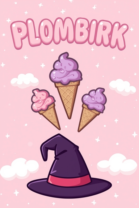 Create a cute, whimsical cartoon-style A4 poster with a pastel pink background filled with soft cloud shapes and small plus-sign sparkles. In the center of the poster, show three ice cream cones floating like magical treats. At the bottom, draw a dark-purple witch hat with red stripe. Ensure the overall mood feels fun, magical, and sweet, like an advertisement for magical ice cream. Use soft shading, smooth vector-style lines, and a kawaii aesthetic.