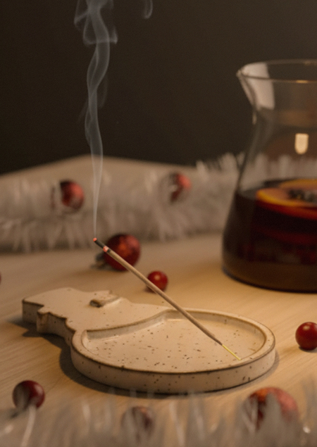 Подставки для благовоний «Запахи чуда» — новогодняя серия декора для неспешных зимних вечеров. Подставки созданы для моментов, когда хочется поставить мир на паузу, зажечь любимый аромат и наблюдать, как в полумраке растворяется тонкая струя дыма. Эти предметы не просто аккуратно собирают пепел и сохраняют пространство чистым, а превращают ожидание праздника в приятный ритуал.