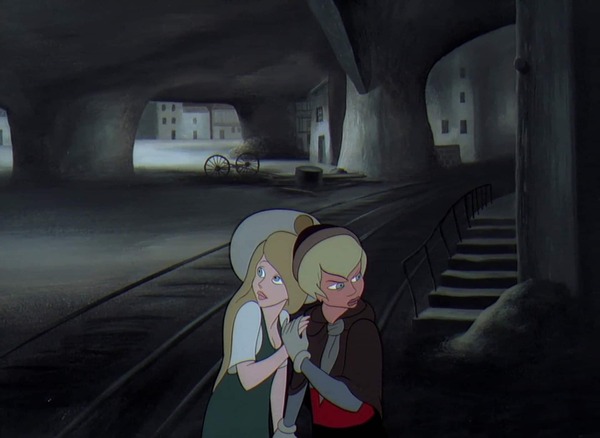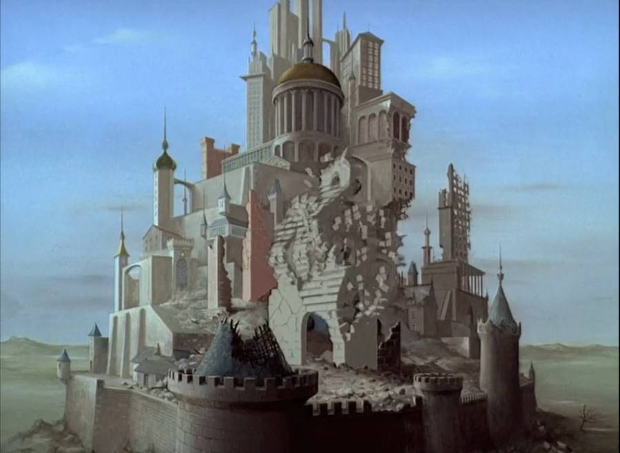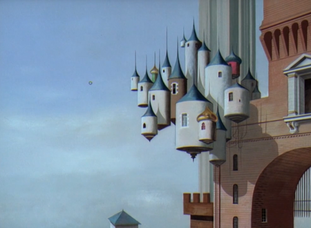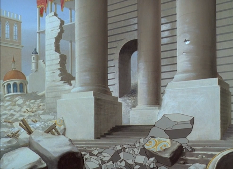 Однако такое обилие смешения всего подряд вытесняет с улиц города главное: людей. Дороги пусты, на них можно рассмотреть разве что полицию да подчиненных короля. Как и в реальном мире, величественная архитектура в мультфильме давит на восприятие, занимает все пространство, и человек рядом с ней кажется ничтожно маленьким.