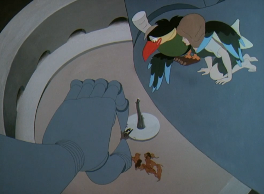 Пространство оказывает большое значение на восприятие картины. В целом, контраст размеров — довольно частый приём, который используется в композиции мультфильма. Чаще всего он обозначает главенство одного объекта над другим, будь то огромный замок и маленький птенчик в начале или большая металлическая рука против клетки в конце.