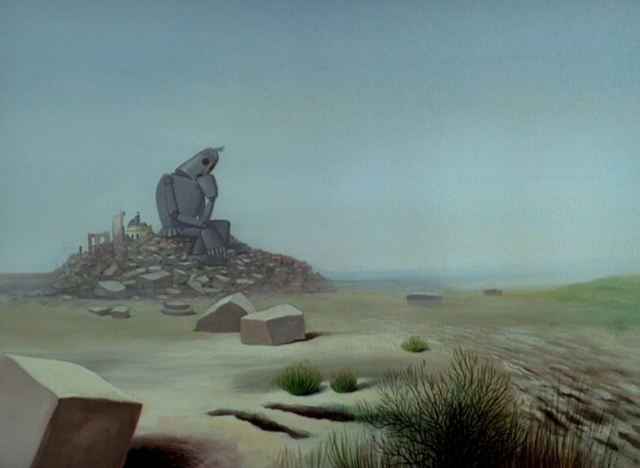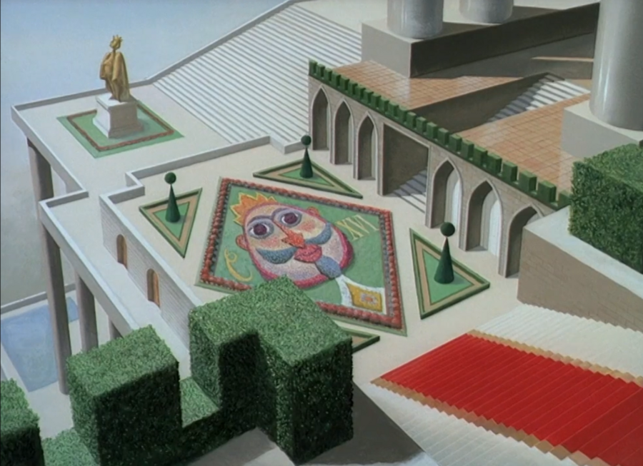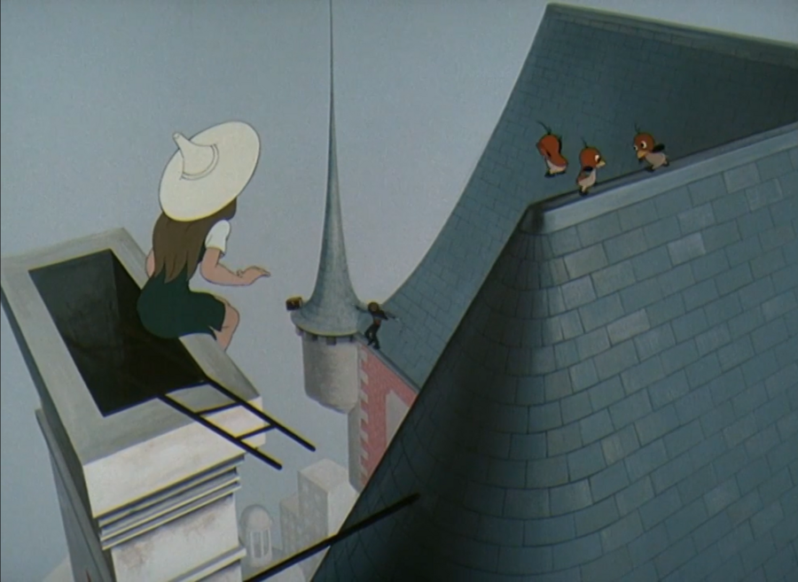 Такое художественное решение с первых секунд выделяет двух главных персонажей, выводя их противостояние на первый план. Всё-таки мультфильм, хоть и снят по мотивам «Пастушки и трубочиста», называется «Король и птица».