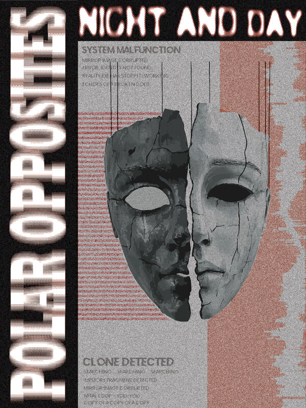 A representation of opposing emotions, and an exploration of themes surrounding imitation, identity and self-reflection, presented in a glitchy, tech style.