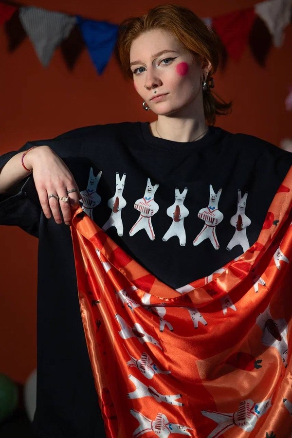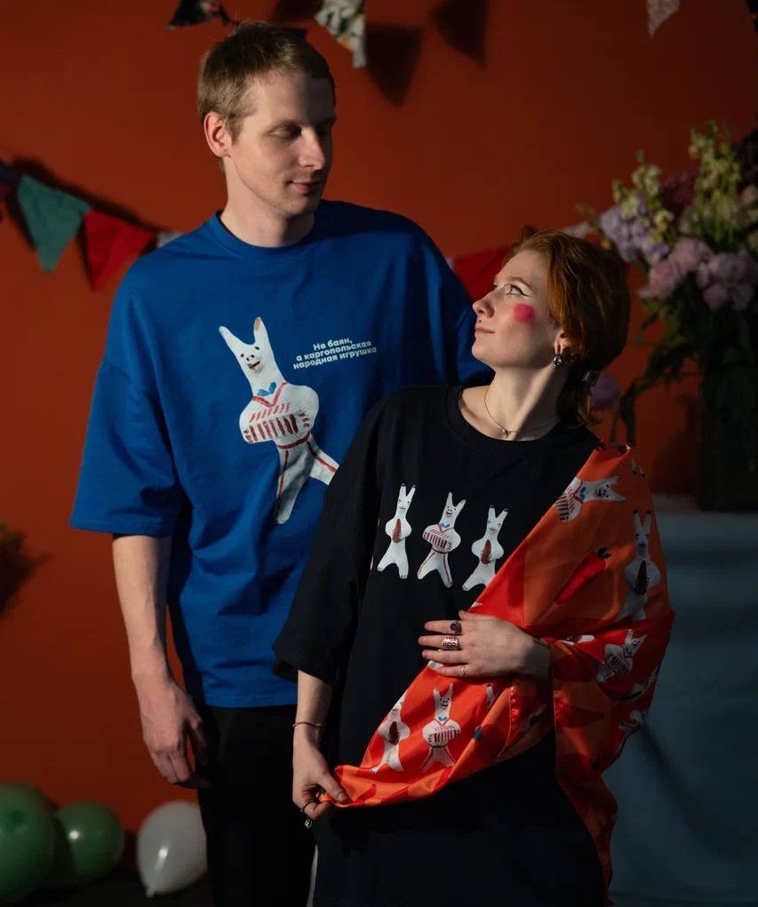 Мой проект вдохновлен Каргопольской игрушкой. На основе фигурок были созданы принты для футболок с забавными надписями, и несколько вариантов палантинов.