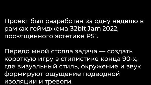 — Проектирование визуальной атмосферы подводного мира для передачи чувства изоляции и тревоги;