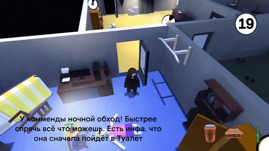 Решением команды стало помещение действия в общежитие утром после вечеринки. Игроку предстояло успеть прибраться до прихода комендантши, чтобы она не заметила бардак и не выписала строгий выговор студенту, устроившему вечеринку.