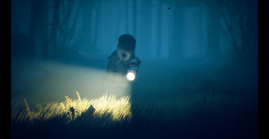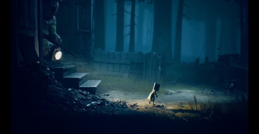 Главные герои Little Nightmares — Моно и Шестая — убегают от охотника и прячутся за деревянными ящиками и травой