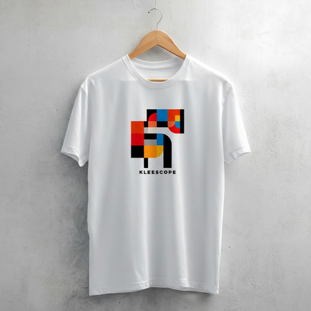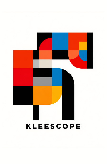 Запрос: Минималистичный логотип в стиле Баухаус, вдохновленный педагогическими эскизами Пауля Клее. Одна непрерывная «гуляющая линия» формирует абстрактный символ, напоминающий калейдоскопический узор. Цветной логотип, на белом фоне. Внизу надпись Kleescope. Графический дизайн, высокая контрастность, чистые формы, вектор.