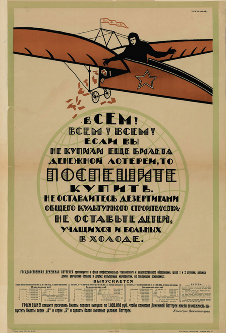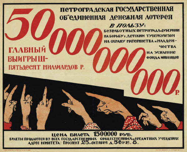 1. Рекламный плакат государственной денежной лотереи Воронежской губернии. Автор: М. Кулешев. 1922–1923 2. Рекламный плакат Петроградской государственной объединенной денежной лотереи. 1922-1923
