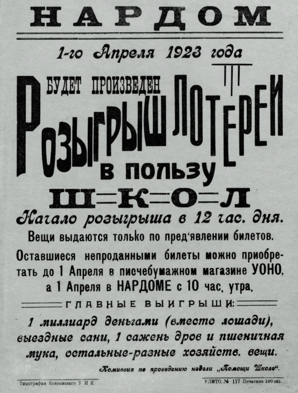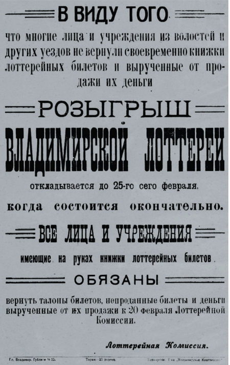 1. Плакат «О розыгрыше Владимирской лотереи». Владимир. 1923 2. Плакат лотереи Владимирского УОНО «В пользу школ и детских домов». Владимир. 1923