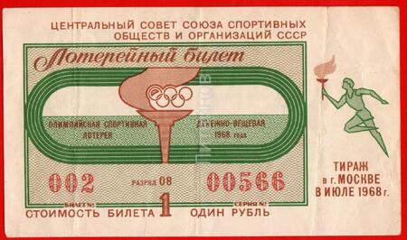 1. Министерство финансов РСФСР лотерейный билет денежно-вещевой лотереи, новогодний выпуск. 1971 г. 2. Олимпийская спортивная денежно-вещевая лотерея. 1968.