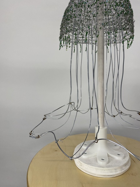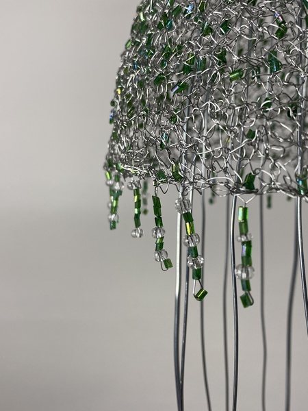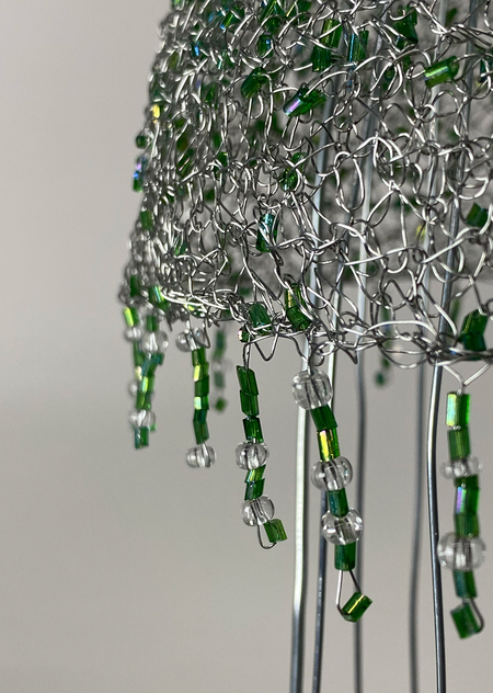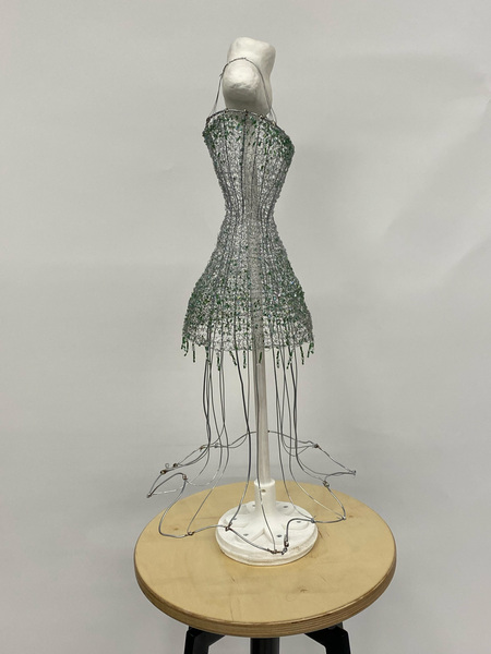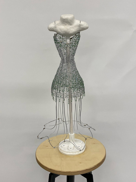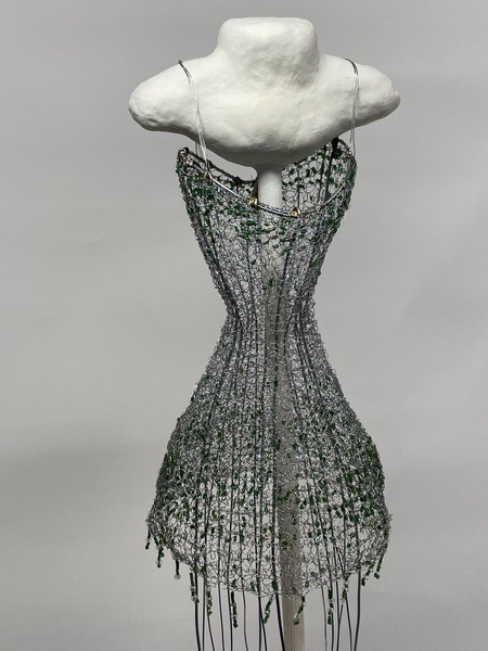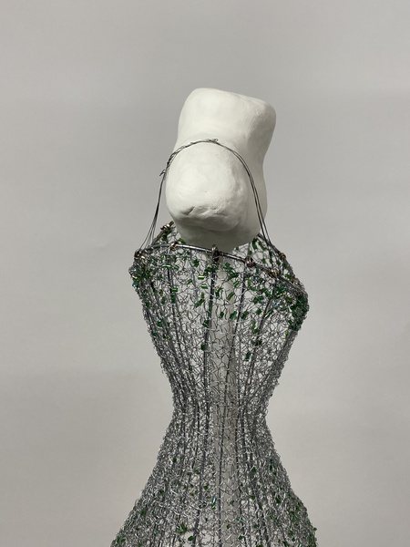 Данный арт-объект представляет собой силуэт платья, выполненный из проволоки с бисерными вкраплениями. Его воздушная конструкция напоминает о революции, которую совершил Поль Пуаре, освободив женское тело от корсета и создав более свободный крой одежды.