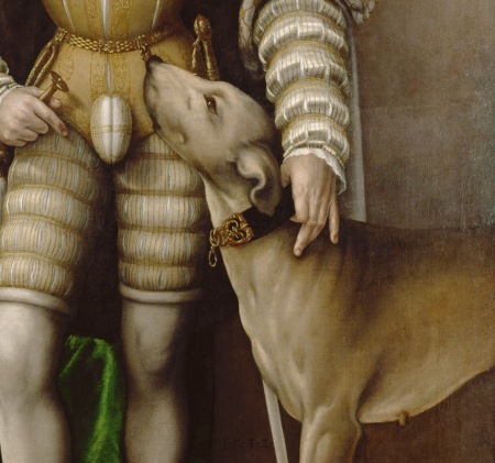 На портрете собака тянет морду к императору, пока тот придерживает ее за ошейник, показывая зрителям свою властную, но заботливую натуру. Будучи правителем, Карлу V необходимо демонстрировать своему народу силу и власть, которой он обладает. В данном портрете изображение собаки дополняет его образ мудрого правителя.