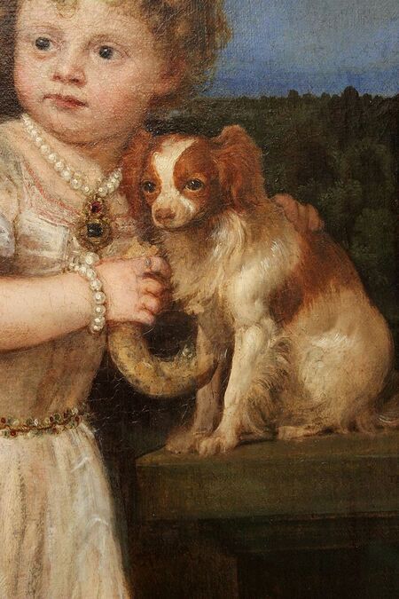 На обоих вариантах портрета немалую роль в композиции играет охотничья собака императора. Как известно, охота была одним из самых популярных развлечений для высшего света стран Европы. В портретах императорской семьи собаки были главным атрибутом, символизируя богатство и достаток, а также мудрость и добродетель изображаемого.