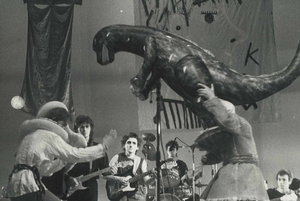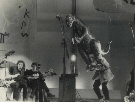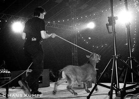Концерт «Поп-механики». Владимир Тарасов и Тимур Новиков с козлом. Ханс Кумпф, 1989 г.