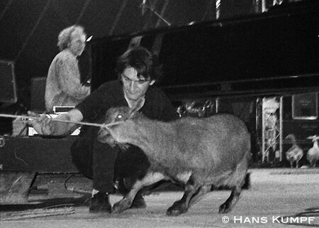 Концерт «Поп-механики». Сергей Бугаев (Африка) с козлом. Ленинград, 1986 г.