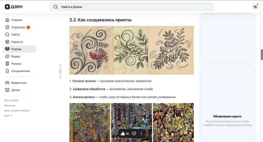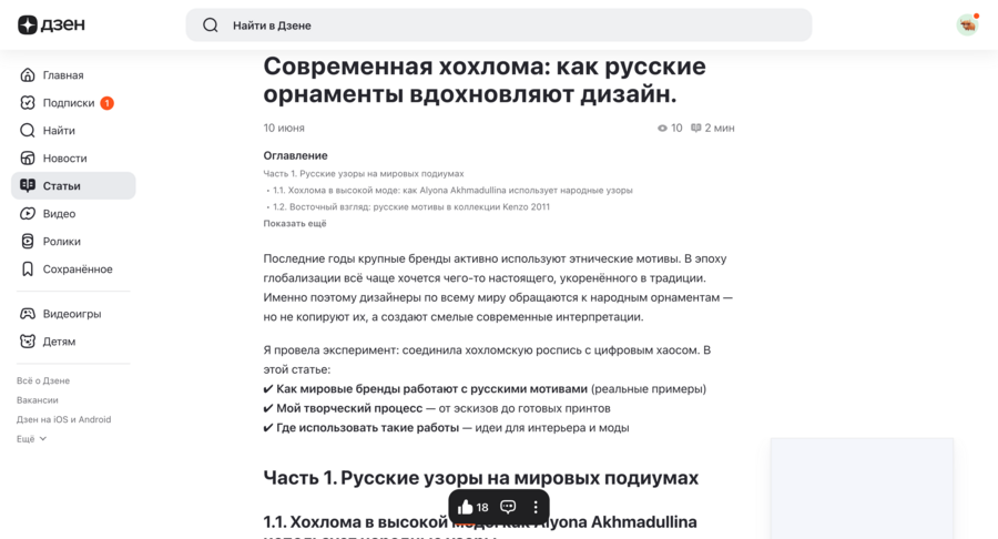 1. Дзен (статья) Статья набрала 11 дочитываний и 18 лайков всего при 6 показах, что говорит о сильной вовлечённости и точном попадании в интересы аудитории. Даже без массового охвата качественный контент, удачный заголовок и чёткая структура доказали свою эффективность.