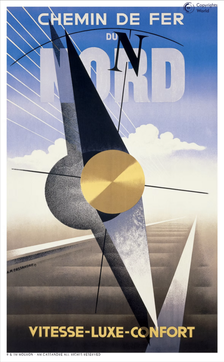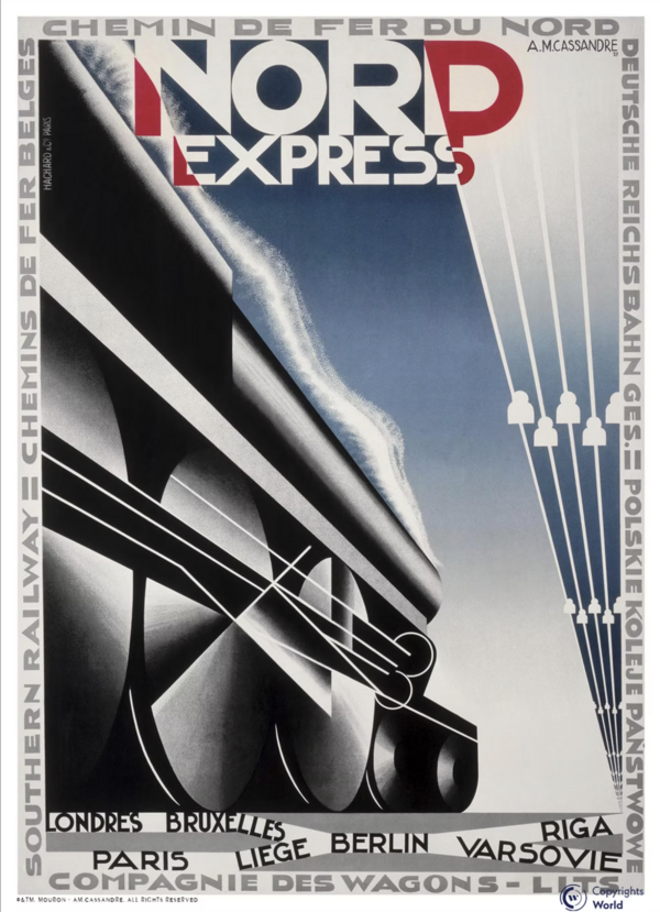 В плакатах для железнодорожных путей Кассандр тоже задействовал схожие приемы: градиент, соединяющий колёса в первом «Nord Express», и «взгляд» снизу во втором, придающий грандиозность изображаемым объектам.