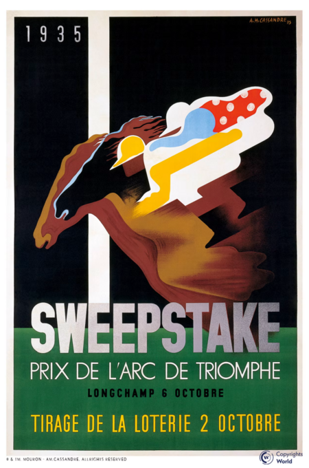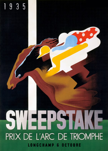 В «Sweepstake» же используется совершенно другой прием: здесь Кассандр использовал полутона и растушёвку. У лошади будто бы четыре передних ноги, но из-за объединения фигур создаётся ощущение скачки. Силуэты всадников тоже размыты, а руки будто уходят вдаль. Такое мы наблюдаем, когда смотрим в окно машины, сосредоточившись на одном объекте, пока все остальные начинают растягиваться.