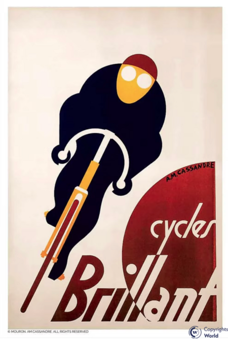 На плакате «Cycles Brilliant» сам велосипед, как и тело велосипедиста, находятся параллельно наклонному тексту, создавая эффект сложного поворота и невероятного разбега.