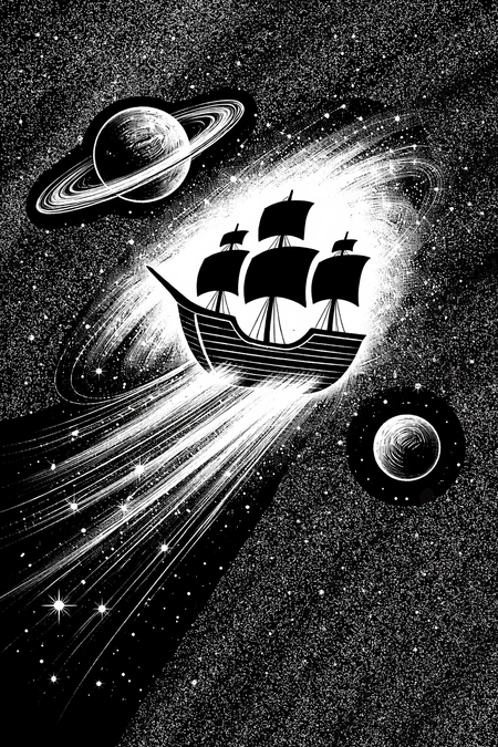 Композиция построена на взаимодействии точки (звёздная фактура), линии (мачта, паруса, концентрические круги) и пятна (силуэт корабля и тёмные массы фона), создающих целостный образ и ритм.