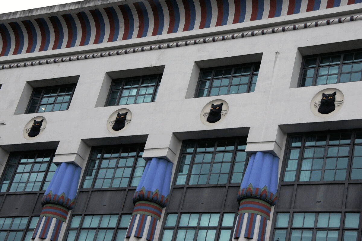 В фабрике английской фирмы сигарет смешиваются ар-деко и египетский стиль. Архитекторы вдохновились открытием мумии Тутанхамона. По этой причине здание обладает таким необычным внешним видом — разноцветные 12 колонн, рельефы черных кошек на фасаде, а также их статуи на входе, олицетворяющею богиню Бастет.