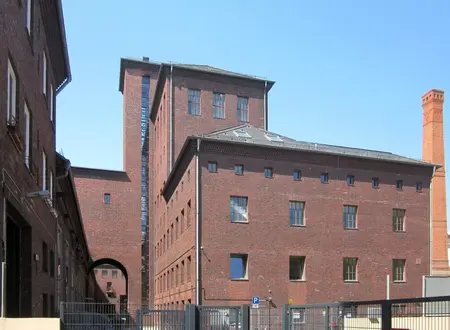 Следующим объектом исследования становится Германия, которая в 20 веке также имела немыслимые промышленные масштабы. Один из самых интересных комплексов находится в Гумбольдтайне — эти здания были предназначены для электротехнической компании «Allgemeine Electricitäts-Gesellschaft» (далее AEG). Интересно, что в комплексе сохранились служебные ворота конца 19 века. И род здания не помешал архитектуру превратить ворота в шедевр. Они выполнены в стиле готического возрождения, о чем говорят стрельчатые арки, боковые башни, ажурная шатровая конструкция. Мозаики отсылают на AEG — лампочки, звезды, молнии, шестеренки связаны с ее деятельностью. [12]
