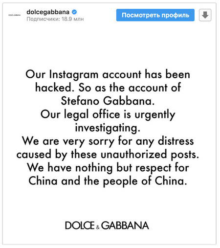 Последующие попытки оправдания не улучшили ситуацию. Габбана заявил, что его аккаунт был взломан. Dolce & Gabbana опубликовали извинение, утверждая, что «чувствуют только уважение к Китаю и его народу». Однако это выглядело неубедительно. Хэштег #DGTheGreatShowCancelled собрал более 870 миллионов просмотров.