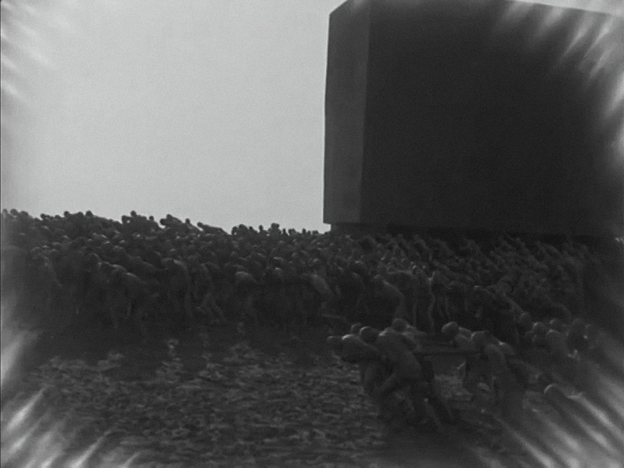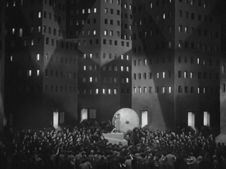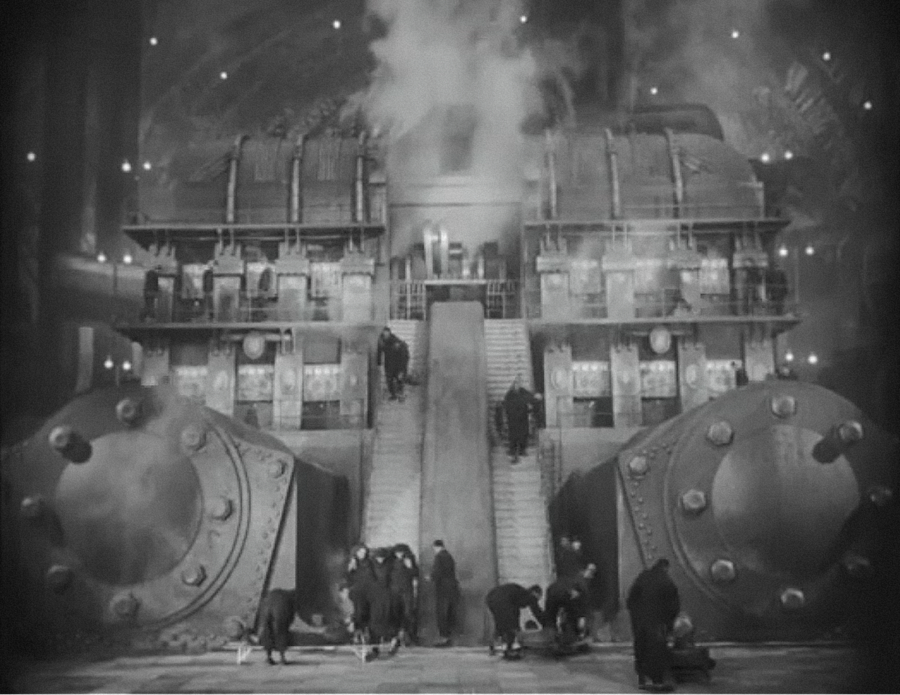 Фриц Ланг выстраивает кадр так, что линия горизонта находится очень низко: архитектура визуально давит на человека, отображая тоталитарную власть. В Метрополисе обычные люди не могут быть свободны — их труд направлен на расширения города для его создателя. По сравнению с огромной машиной масса рабочих выглядит маленькой, люди находятся под ее гнетом.