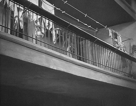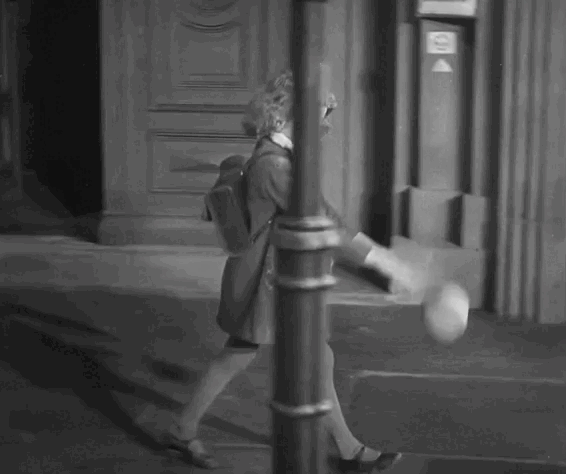 В начале «М» героиня весело играет в мяч, идя по улице — ее детскость, наивность контрастирует с бетонным неуютным городом, говоря о его небезопасности.