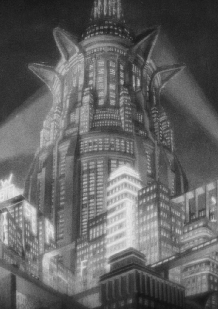 Здания из фильма будут практически воплощены через несколько лет спустя — так «Метрополис» предвещает мир, в который превратится Германия.