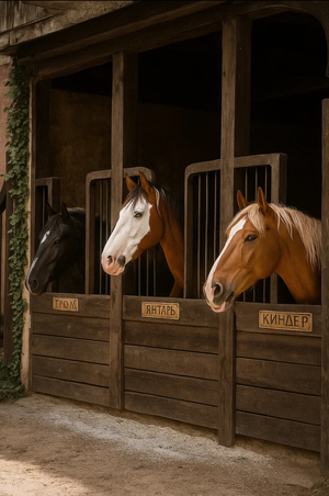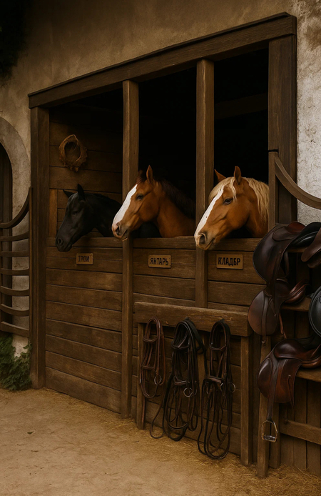 Sora Promt: Take the image of the stable from this picture and generate a realistic photo of this space. Horizontal image. tones are the same. wooden stable. add another stand with ammunition. there should be saddles and bridles. Generate a lawn under the sun, where there is a pen, and in the pen there is a herd of horses