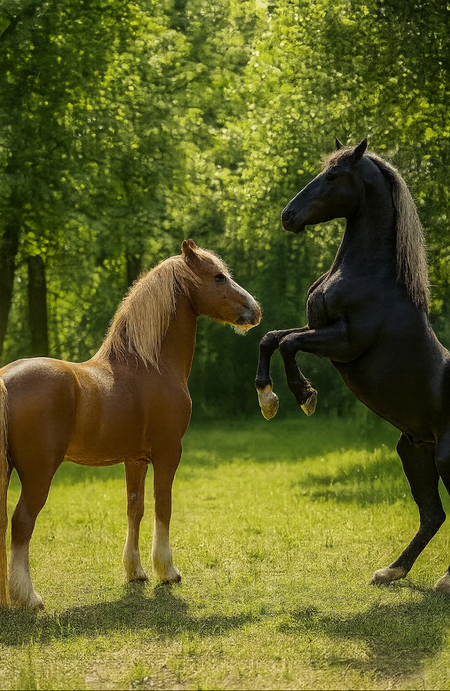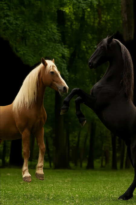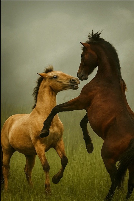 Sora Promt: Take these two horses from my picture. take a realistic photo. horses and the color palette should be like in the picture.