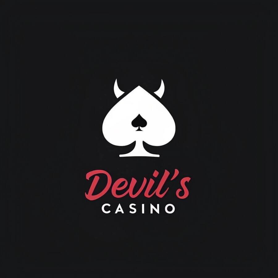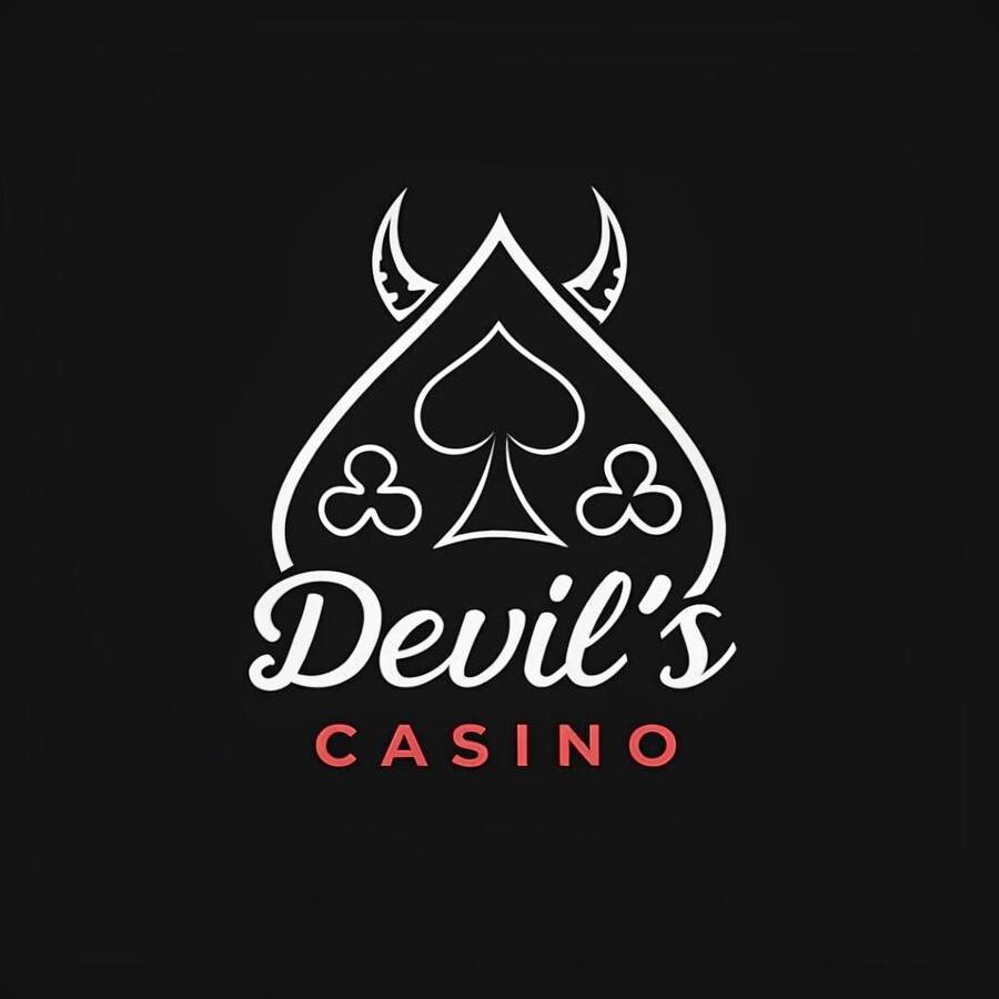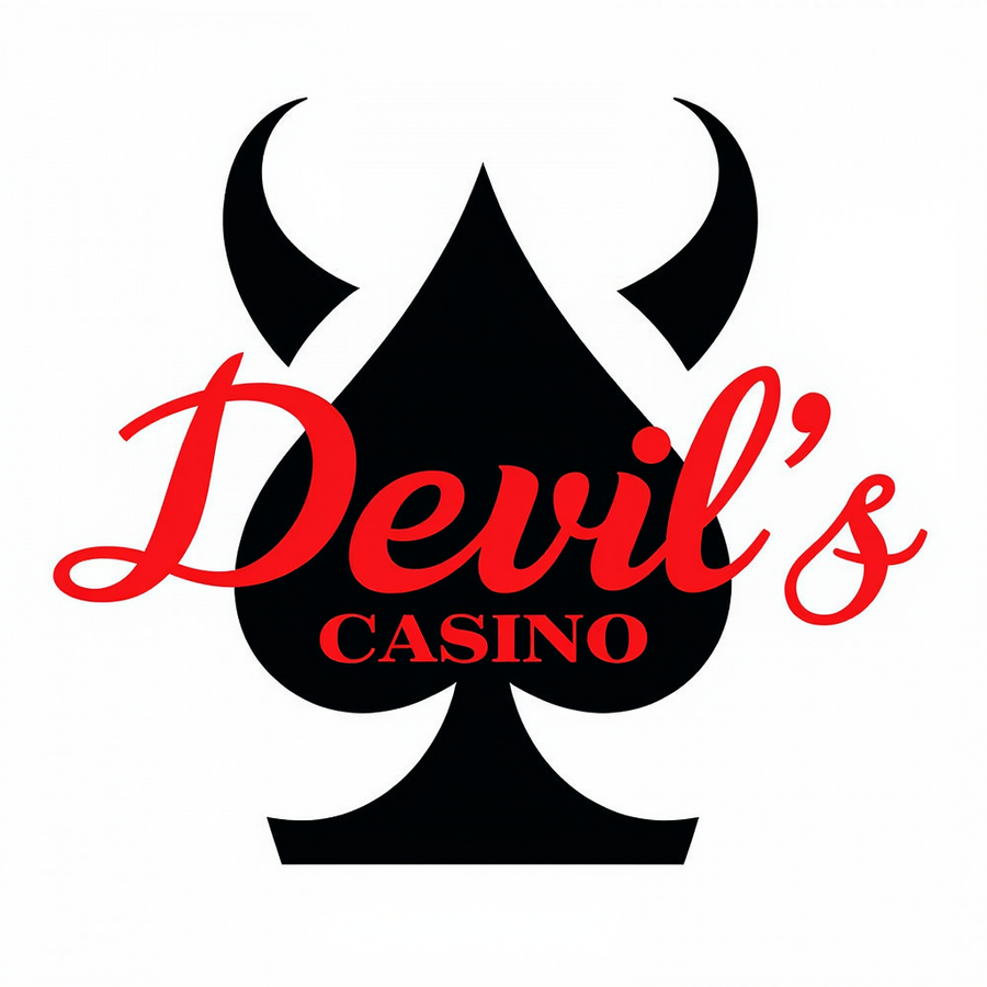 ЛОГОТИП Промт: Create a minimalistic style logo for «Devil’s Casino». premium brand, secret society. Main colors: black and white. Minimalistic handwritten red font. The main character is a spade with devil horns.
