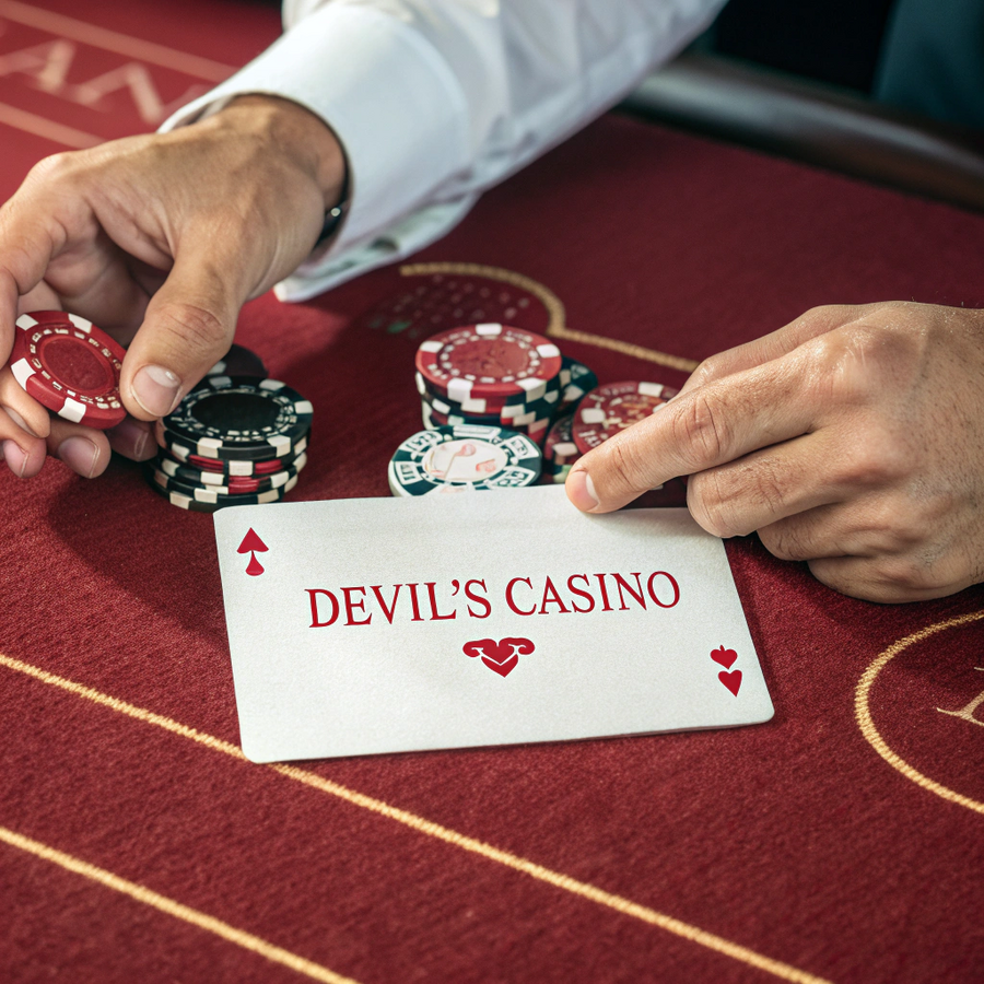 Промт 2: generate a mockup of casino playing chips and cards on a white background for the Devil’s Casino. The king is depicted on the cards as devil. The main color as white, black, red Сгенерировано в Recraft Ai
