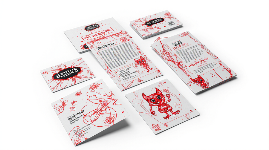 НОСИТЕЛИ Промт 1: generate a mockup of printed materials (paper, envelope, business cards) on a white background for the Devil’s Casino inspired by how the children ruined the documents with red pencils, drawing a lot of little devils. The main color as white, black, red Сгенерировано в Krea