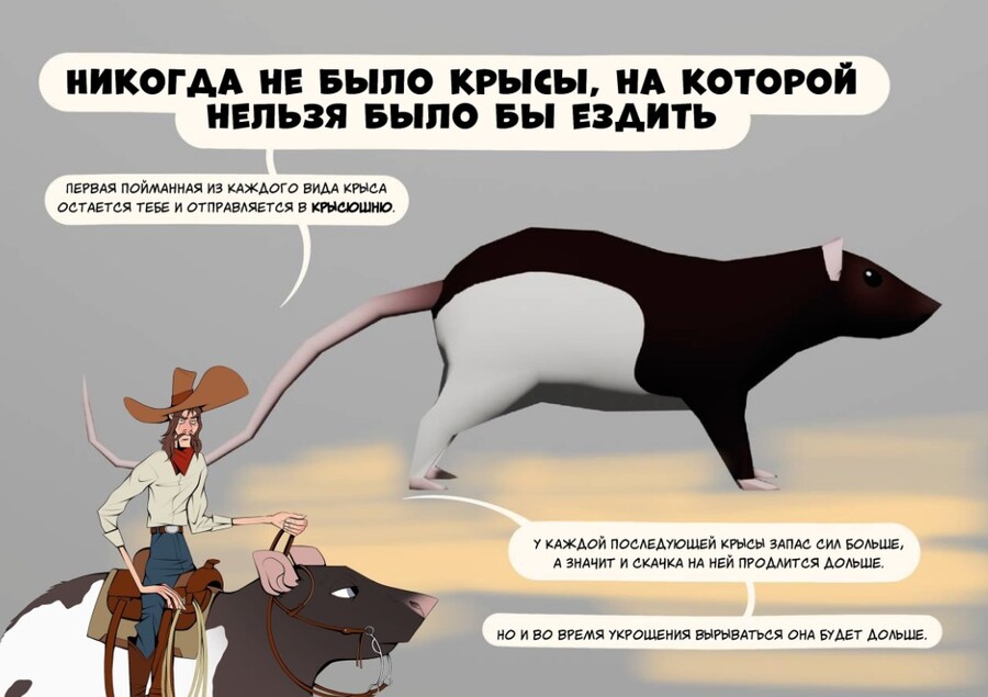 Компьютерная 3D top-down игра в жанре roguelike. Howdy, ковбой! Слышал, ты новый загонщик в этом захолустье. Быстрее вскакивай на свою крысу и отправляйся на пастбища, ловить новых. Может, в один день, ты станешь легендарным загонщиком и сумеешь поймать самого Гигантского Гамби.