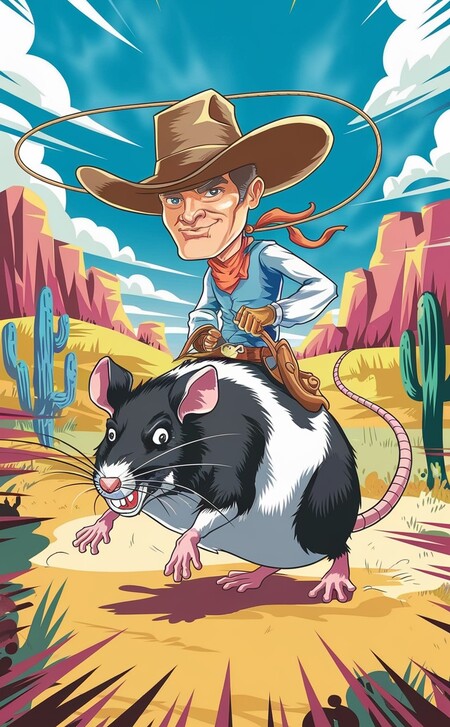 Промпт для обложки: A dynamic and visually striking poster featuring a cowboy in a wide-brimmed hat riding a large black and white rat. The cowboy holds a lasso confidently in one hand, showcasing a sense of adventure and control. The background depicts a vibrant wild west landscape with rolling hills, cacti, and a bright blue sky, emphasizing the cowboy’s journey. The overall style should be colorful and cartoonish, capturing a playful yet adventurous spirit. Style cartoon.