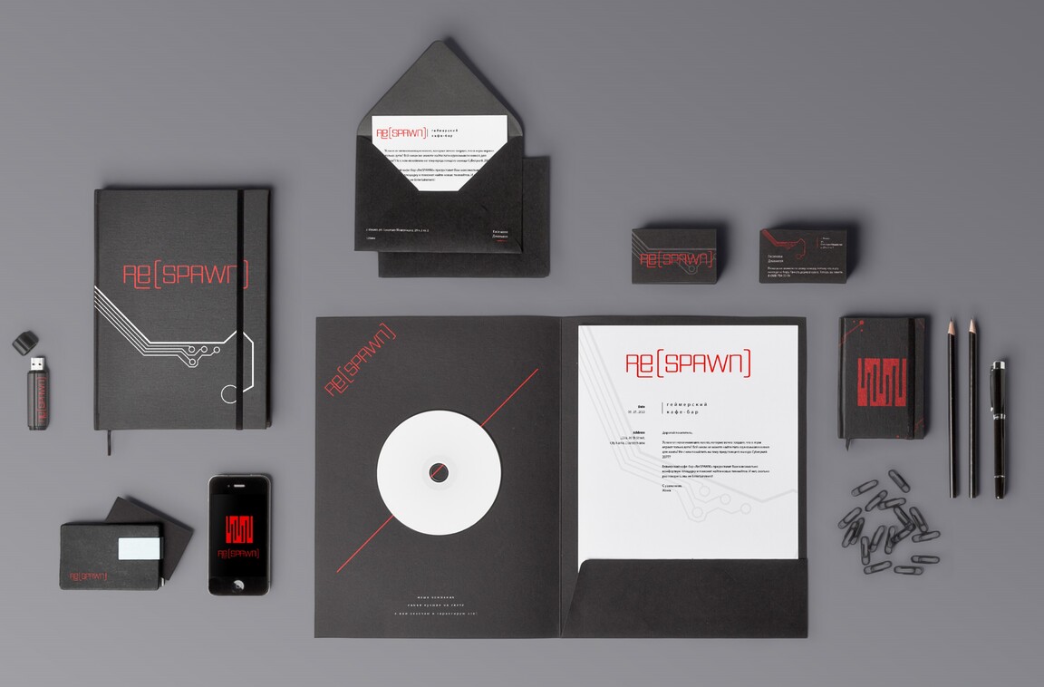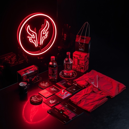 Промпт 2: Full brand implementation kit for RE (SPAWN) — includes neon signage, bar coasters, drink bottles, packaging, loyalty cards, and merchandise arranged together on a dark surface. Clean photography lighting, subtle red glow reflections, cyber gaming style.
