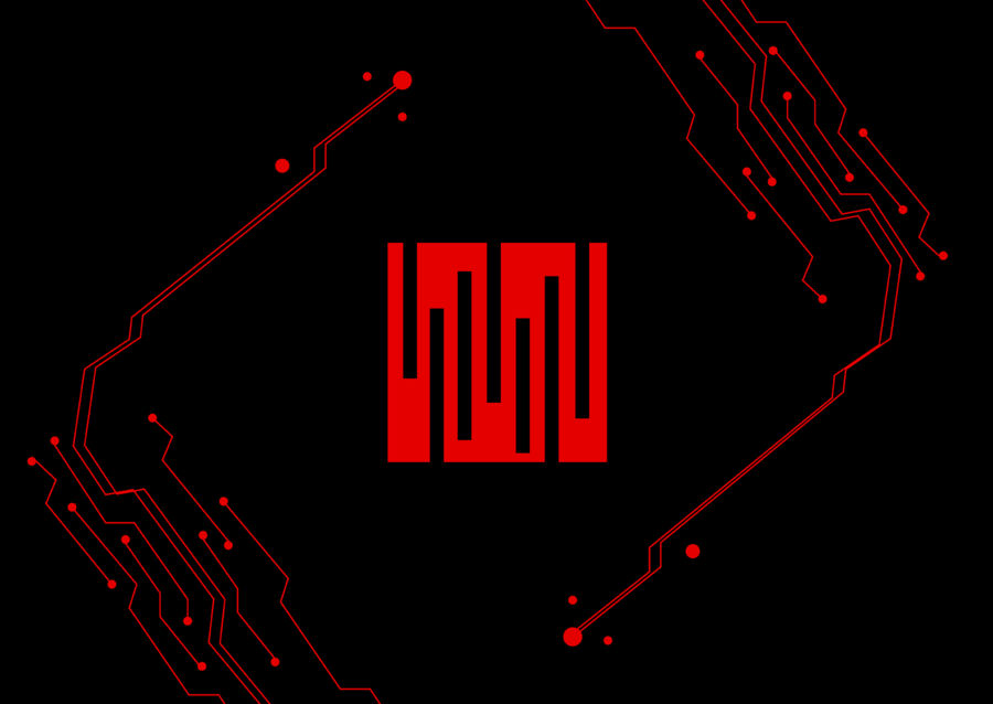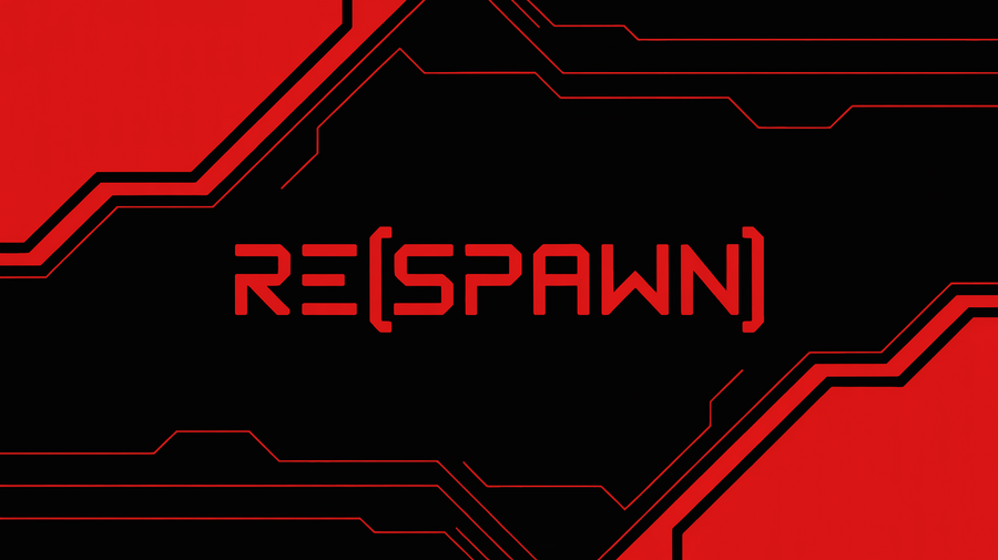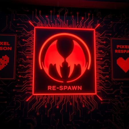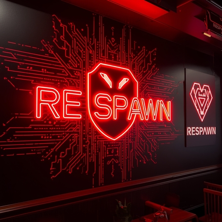 Промпт: Mockup of RE (SPAWN) interior signage — large red neon logo on black wall, surrounded by glowing microchip patterns. Includes wall posters of pixel hearts and respawn icons in matching color scheme. Futuristic cyber café-bar vibe.