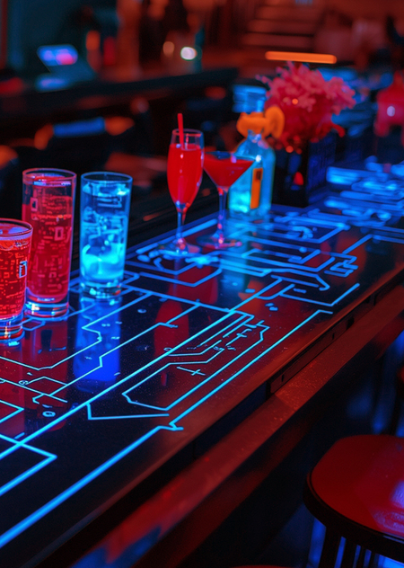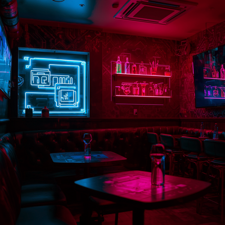 Первые генерации, промпт: Interior of a gaming café-bar called RE (SPAWN), dimly lit with soft neon lights in blue and magenta, glowing signs with pixel art designs, bar shelves filled with futuristic game-inspired drinks, tables shaped like microchips, and ambient reflections from gaming monitors — cozy cyberpunk vibe.