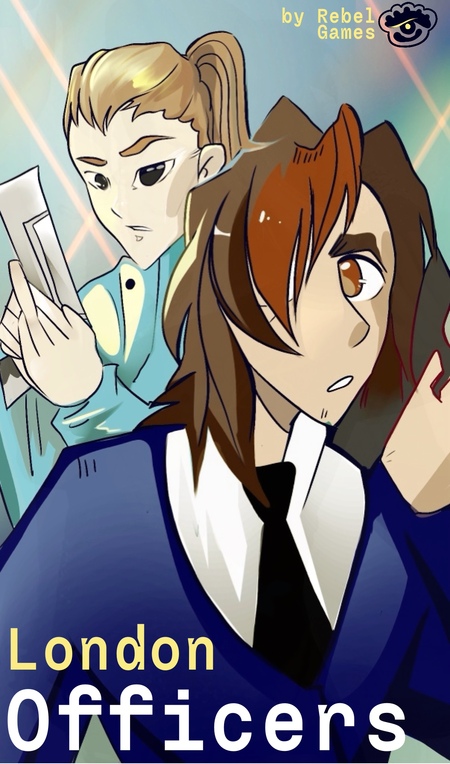 Промпт: Generate a box for a card game called «London Officers» using the added image as reference and put a second game called «Rebels of the „L“ city» of the same series in a red box next to it. Use a clipart cartoony style for both cover art and for depicting the boxes.