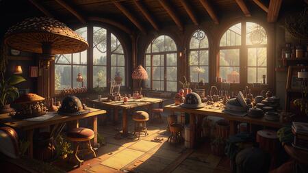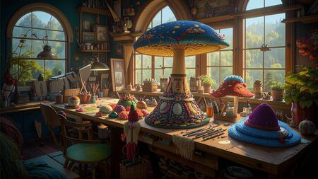 Промпт: интерьер ателье где изготавливаются грибные шляпы
