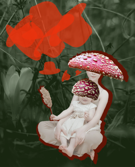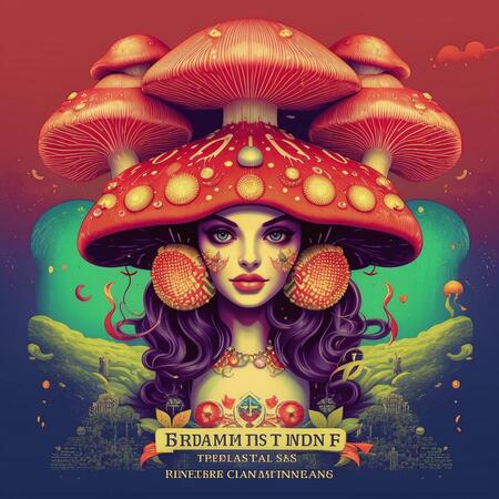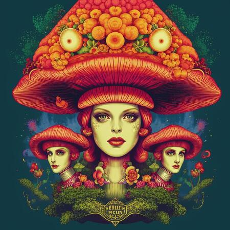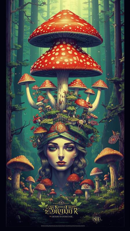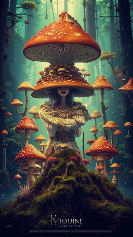 Промпт: рекламный постер с текстом на котором изображены грибы в головных уборах