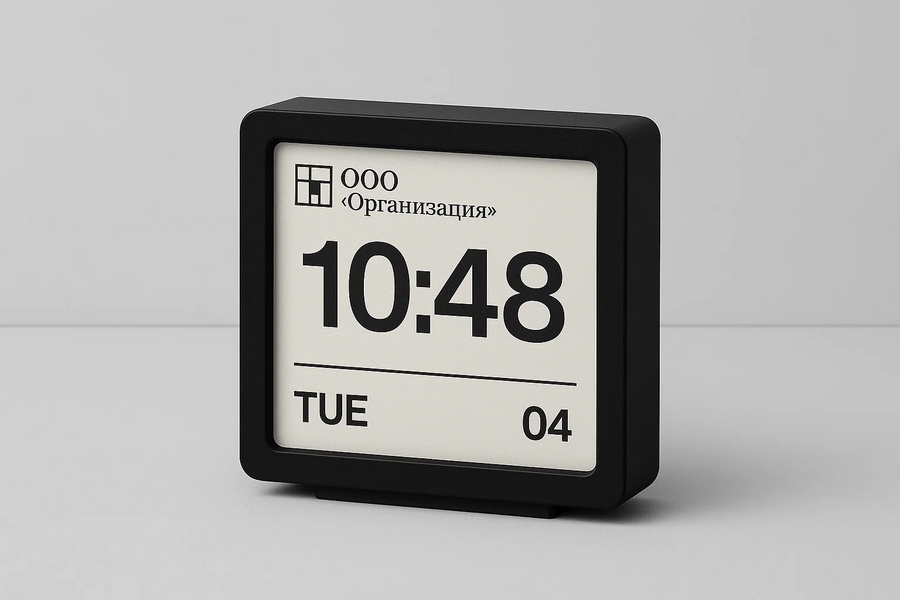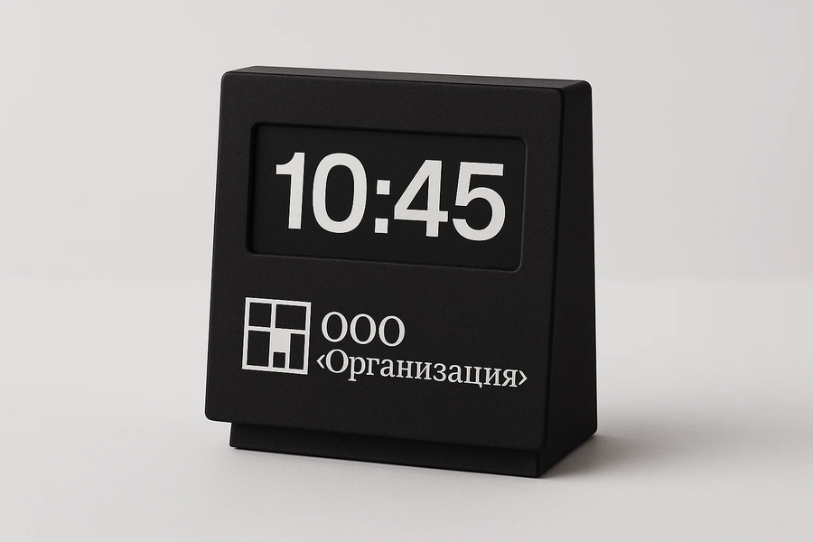 /image prompt: create a table clock. It should be square/rectangular in shape. Add a logo. Use a minimalist style. Place the clock on a light-colored background.