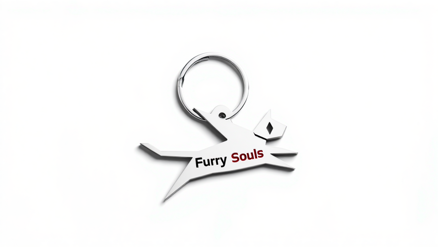 Промт для брелока: Create a metal keychain for this brand in the shape of a cat with the name Furry Souls on a white background.