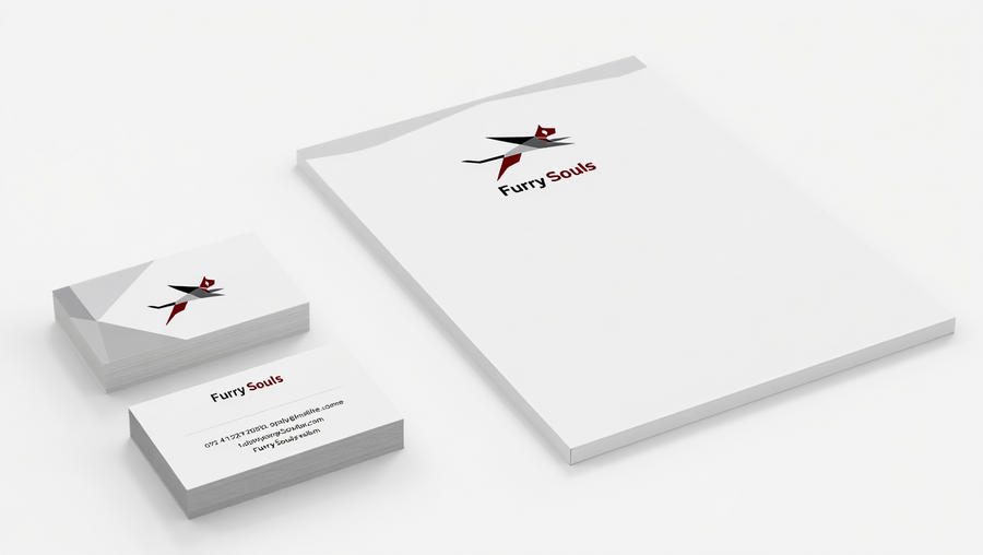 Промт для документации: Create a professional branded layout with an elegant and modern design for Furry Souls, a company specializing in the rehabilitation of cats that have misbehaved in their lives. Highlight a set of stationery, including a letterhead and business cards in colors 730217 and F2F2F2, featuring the company logo. The composition should emphasize a minimalist, sophisticated aesthetic on a bright white background.