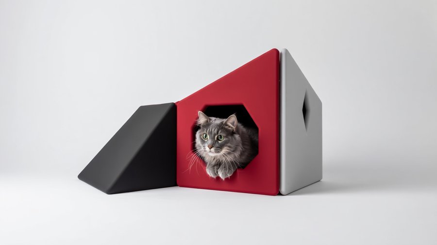 Промт для кошачьего домика: Create a toy house for your cat. Make it on a white background and in your brand colors.