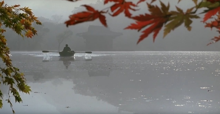 Динамика взаимодействия героя с водной гладью в фильме «Весна, лето, осень, зима… и снова весна» служит точным визуальным сейсмографом его душевного состояния. В начальных стадиях его пути, когда сознание монаха чисто, а практика сосредоточена, его гребля ритмична и бережна. Весло плавно входит в воду и выходит из нее, почти не нарушая зеркальной поверхности озера. Этот жест можно уподобить медитативному касанию — он не столько рассекает стихию, сколько гармонично с ней взаимодействует, следуя ее естественному течению.