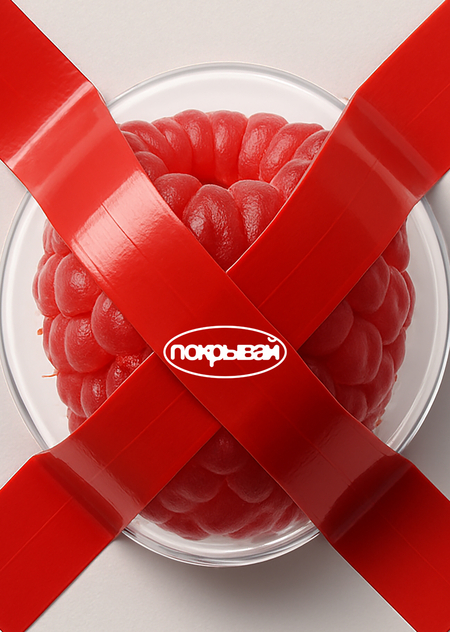 Бренд «Покрывай» — это воображаемая компания, ориентированная на экологичные технологии защиты урожая и созданная как ответ на растущую потребность в безопасных альтернативах химическим инсектицидам. Основой продуктовой идеи бренда становится биоразлагаемая смарт-оболочка для ягод — наногель-спрей, который после нанесения образует на листьях и плодах тонкий невидимый защитный слой. Он распространяет мягкий вкусо-ароматический сигнал, неприятный для вредителей, но полностью безопасный для человека, пчёл и полезных насекомых. Он не влияет на вкус ягод, легко смывается водой и естественным образом разлагается без следа, сохраняя чистоту продукта и баланс экосистемы. Логотип бренда визуально строится вокруг идеи защиты ягоды, название «покрыто оболочкой». Цветовая палитра сочетает яркий оттенок красного и синего — оттенки основных ягод: малина и голубика. глубокие ягодные цвета, подчёркивают экологический и «домашний» характер бренда, а также подчёркивая его принадлежность к современным биотехнологическим решениям.