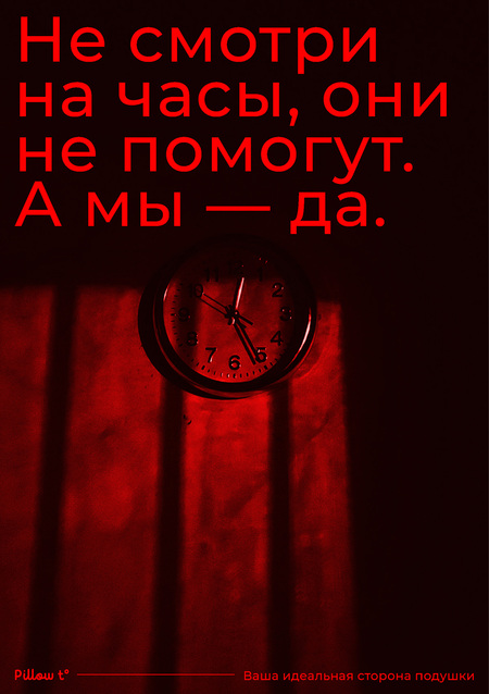 Для финальной рекламной кампании был выбран приём шока, главным элементом являются часы, на которые люди с бессонницей постоянно смотрят ночью, в ожидании сна.